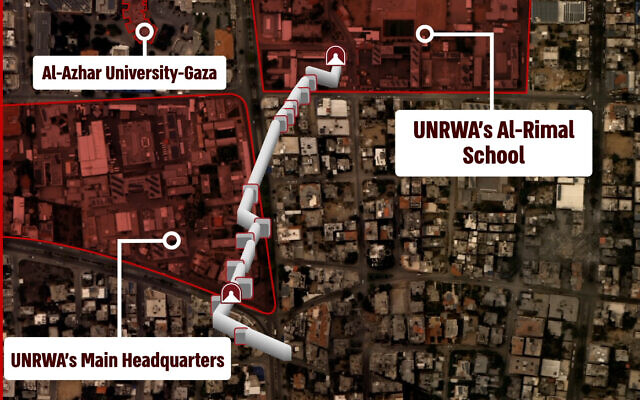 An IDF infographic released February 10, 2024, showing the route of the Hamas tunnel found under UNRWA’s Gaza headquarters. (Israel Defense Forces)