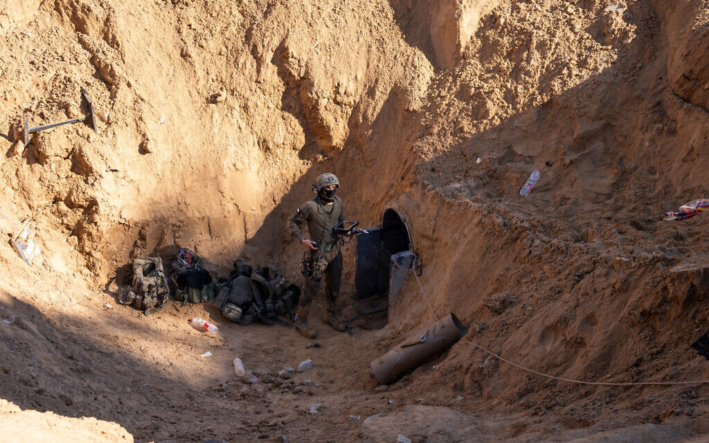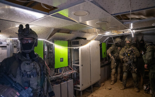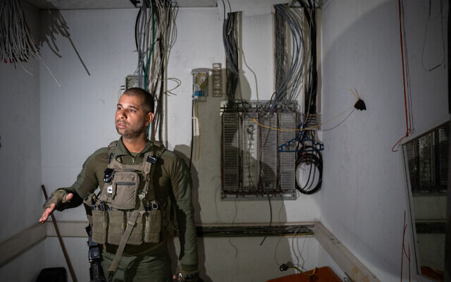 A soldier of the Yahalom unit stands outside a tunnel leading to a Hamas data center, uncovered by the IDF in Gaza City, February 8, 2024. (Emanuel Fabian/Times of Israel)