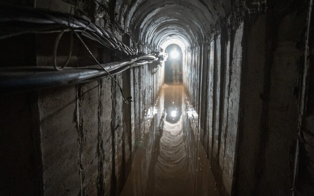 A flooded tunnel leading to a Hamas data center, uncovered by the IDF in Gaza City, February 8, 2024. (Emanuel Fabian/Times of Israel)