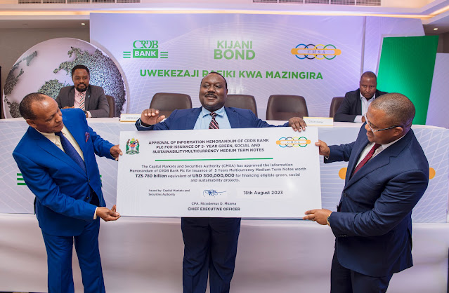Dar es Salaam, 24 Agosti 2023: Katika juhudi za kuongeza uwezo wake wa kufanya uwezeshaji wa miradi rafiki kwa mazingira, Benki ya CRDB imepata idhini kutoka Mamlaka ya Masoko ya Mitaji na Dhamana (CMSA) kuuza Hatifungani ya Kijani (Green Bond) yenye thamani ya dola 300 milioni za Marekani (takriban Shilingi bilioni 780). Benki ya CRDB inaweka historia ya kuwa taasisi ya kwanza kutoa hatifungani ya kijani hapa nchini inayoweka mkazo katika masuala ya mazingira na kubwa zaidi kusini mwa Jangwa la Sahara.
