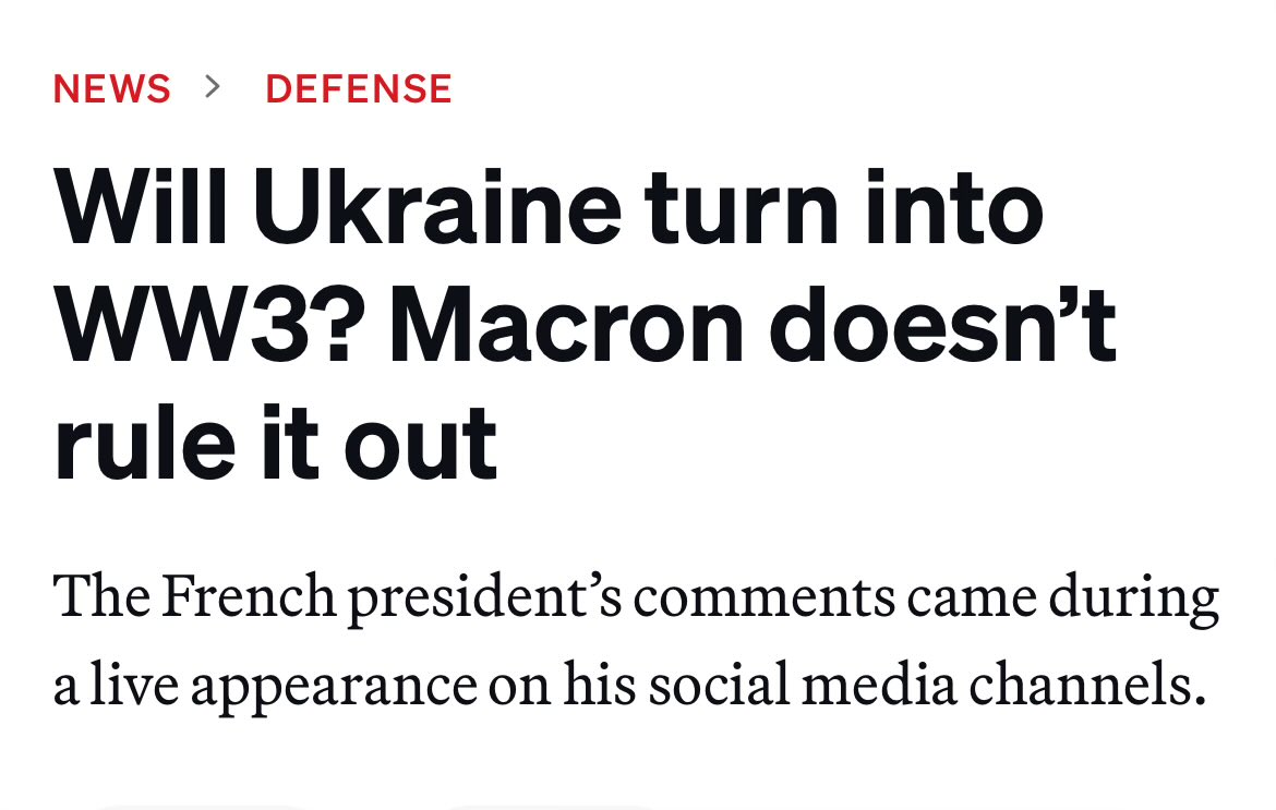Meanwhile, in France. President Emanuel Macron did a live stream on his Social MEdia. During that live feed, he was asked "Will Ukraine turn into World War 3?" Macron replied "That cannot be ruled out."