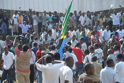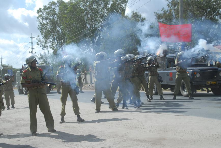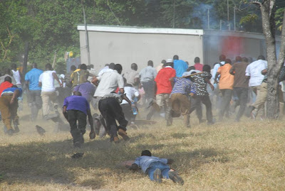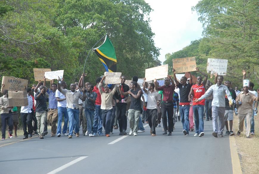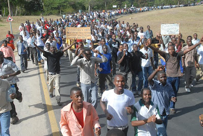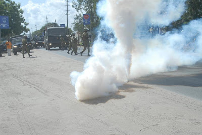 Askari wa kutuliza ghasia (FFU) wakifyatua mabomu ili kuwatawanya wanachuo wa Chuo Kikuu cha Dar es Salaam, waliokuwa wakiandamana leo asubuhi kuelekea Ofisi ya Waziri Mkuu kwa ajili ya kufikisha malalamiko yao ya posho ya Sh 5,000/ ambayo wanadai ni ndogo haitoshi kwa matumizi na badala yake wanaishinikiza Serikali kuwapa Sh. 10,000/=. Hata hivyo maandamano hayo yaliishia maeneo ya Savei baada ya kukuta ukuta wa polisi hao umetanda Barabarani huku wakitoa matangazo ya kusitisha maandamano hayo na kutawanyika, baada ya kutoa matangazo hayo na wanafunzi hao waliendelea kuwa maeneo hayo huku wakiimba ndipo askari hao waliamuliwa kuanza kufyatua mabomu ili kuwatawanya. Katika tukio hilo hakuna aliyejeruhiwa ila ni wanafunzi wachache tu waliokamatwa.