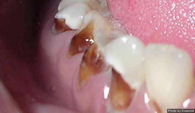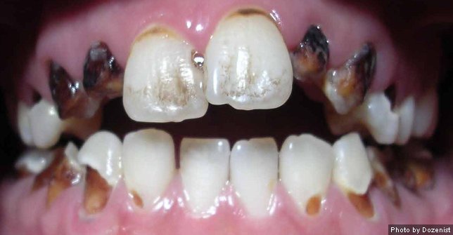 The picture below is of a patient that came to a dental school who was suspected of using methamphetamine. All of the brown and dark brown on his teeth are cavities. The methamphetamine has helped the bacteria in the mouth eat away at the teeth.