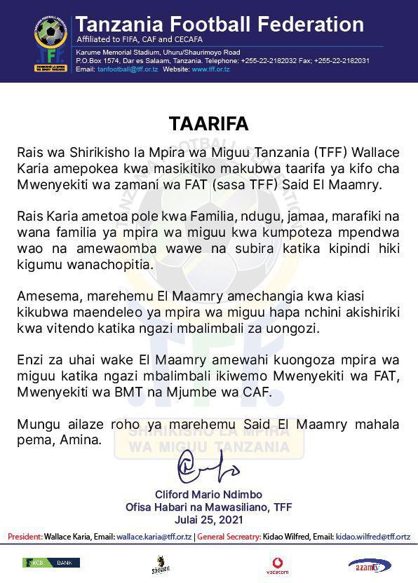 aliyewahi kuwa mwenyekiti wa FAT taifa Sasa tff bwana Said el MAAMRY amefariki dunia usiku wa kuamkia leo.
