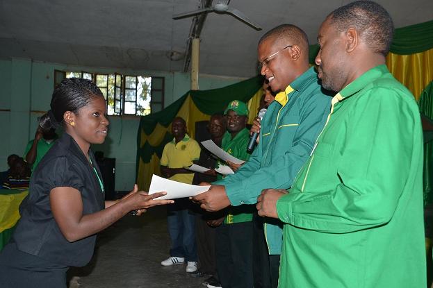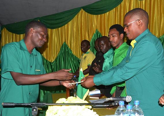 Katibu wa NEC Itikadi na Uenezi, Nape Nnayue akimkabidhi cheti cha mwanachama mwaminifu wa CCM, Dotto Omari, katika sherehe hiyo . Mwenyekiti mstaafu wa CCM tawi la CCM, Chuo cha Sanaa, Lugha na Sayansi ya Jamii, Chuo Kikuu cha Dodoma, Salum Nyambi, ambaye anasoma shahada ya Uhusiano wa Kimataifa, akimkabidhi kitabu cha Azimio la Arusha, Katibu wa NEC, Itikadi na Uenezi Nape Nnauye, katika sherehe ya kuwaaga wahitimu wa mwaka wa tatu wa chuo hicho, iliyofanyika jana kwewnye ukumbi wa Kilimani mjini Dodoma.