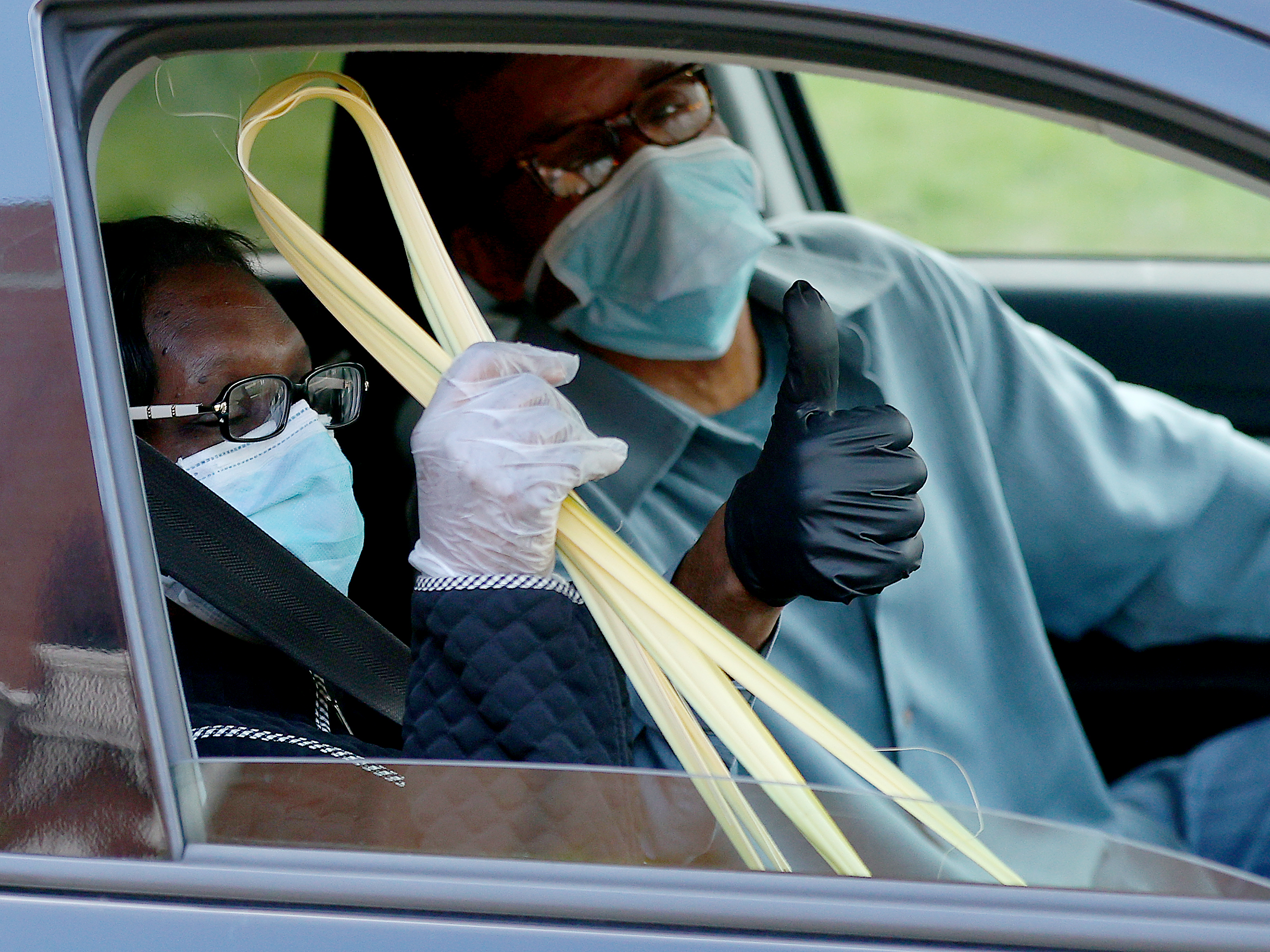 Rob Carr/Getty ImagesA couple hold up a palm leafs after attending a walk-through Palm Sunday Service at Friendship Baptist Church on April 5, 2020 in Baltimore, Maryland.