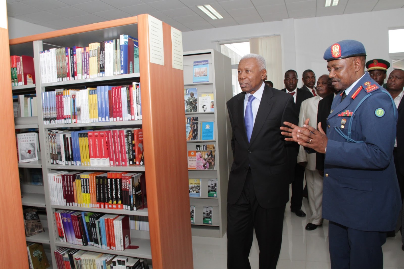 Makamu wa Rais wa Jamhuri ya Muungano wa Tanzania, Dkt. Mohammed Gharib Bilal, akiongozwa na Mkuu wa Chuo cha Taifa cha Ulinzi, Charles Makakala, wakati alipokuwa akitembelea katika Maktaba ya chuo hicho, baada ya kufunga rasmi Kozi ya Kwanza ya Chuo hicho, leo.