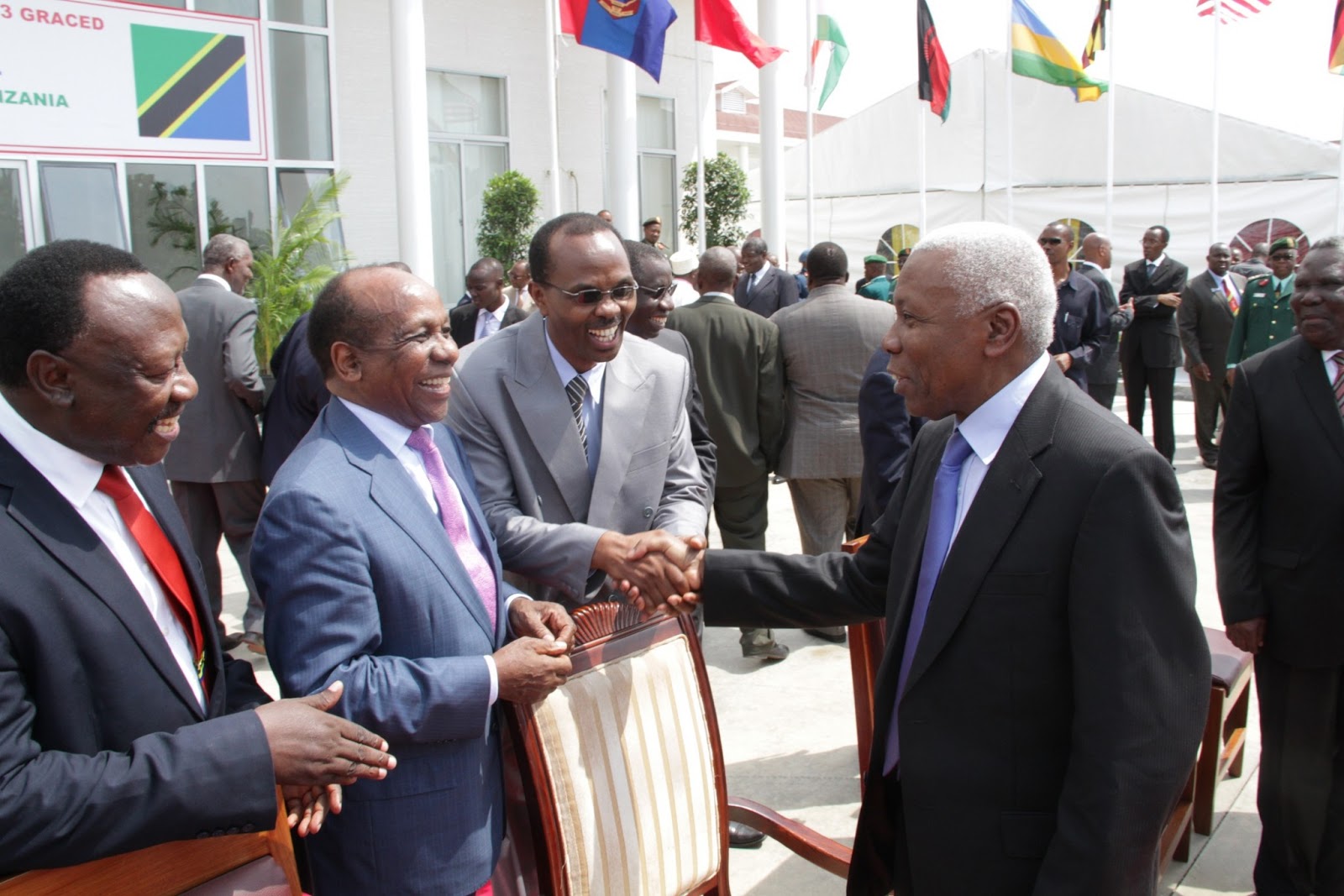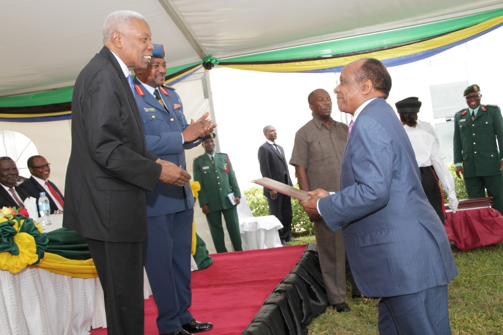 Makamu wa Rais wa Jamhuri ya Muungano wa Tanzania, Dkt. Mohammed Gharib Bilal, akiagana na baadhi ya Wakufunzi wa Kozi hiyo, Eginald Mihanjo, Reginald Mengi na Ibrahim Lipumba, baada ya kufunga rasmi Kozi ya Kwanza ya Chuo hicho, leo.