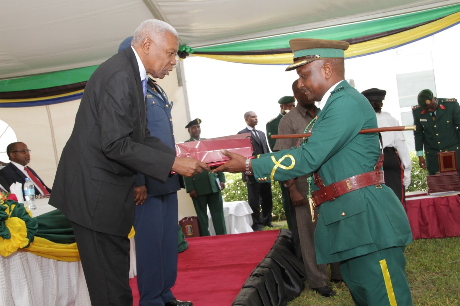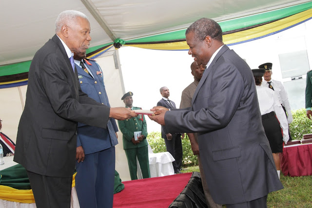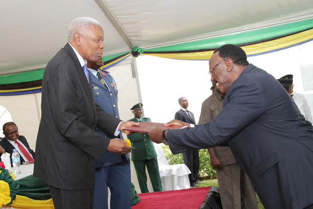 Makamu wa Rais wa Jamhuri ya Muungano wa Tanzania, Dkt. Mohammed Gharib Bilal, akimkabidhi Cheti cha utambulisho wa Ukufunzi wa Kozi maalum ya Kwanza ya Mafunzo, katika Chuo cha Taifa cha Ulinzi (NDC) Gen Mstaafu wa Jeshi, George M. Waitara (Rtd) wakati wa sherehe za kufunga Kozi hiyo zilizofanyika katika Chuo hicho, Kunduchi jijini Dar es Salaam, leo.