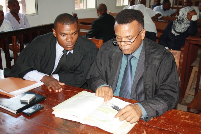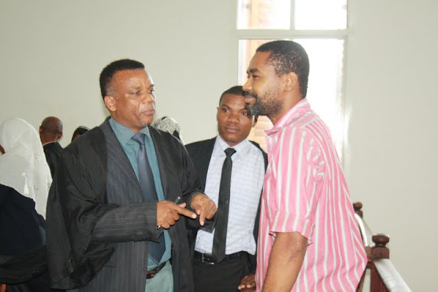 Mawakili wanaomtetea Mtuhumiwa wa mauaji ya Padri , Evarist Mushi wa Kanisa Katoliki parokia ya minara miwili mjini Zanzibar, Omar Mussa Makame (35) wakili Abdalla Juma (kulia) na Rajab Abdalla wakiwa mezani pao kabla ya kutajwa kwa kesi ya mteja wao katika mahakama Kuu Vuga mjini Zanzibar