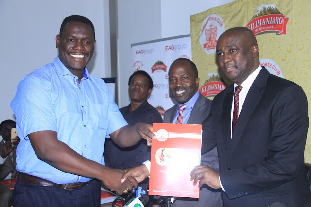 Balozi wa Simba Octa Mshiu akipokea Hati ya Ubalozi kutoka kwa Rais wa Simba Evans Aveva. Anayeshuhudia ni Afisa Mtendaji Mkuu wa Eaggroup Imani Kajula