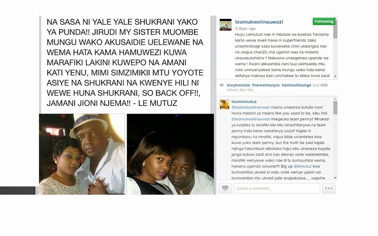 Teamlemutuz TEAMukwelinauwazi naona umeanza kufulia now! Huna mastori ya maana like you used to be, siku hizi TEAMukwelinauwazi imegeuka team penny!! Mnakazi ya kutetea tu kinafiki kila kitu kinachifanywa na team penny hata kama wanafanya uozo!! Kajala ni -------- na mnafiki, najua bibie unamtetea kwa kuwa yuko team penny, but the truth be said kajala mjinga hakumbuki alikotoka hajui siku anaweza kupata janga kubwa zaidi and hao alionao wote watamkimbia, marafiki wenyewe wako nae ili tu kumuumiza wema, hawana upendo wowote!!!! Big up lemutuz kwa kumwambia ukweli si watu wote wenye ujasiri wa kumwambia mtu ukweli pale anapokosea..... waache mburulaazzz waongeee