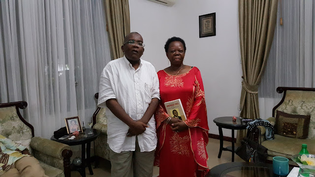 Kulia Daisy Abdulwahid Sykes na Mwandishi akiwa ameshika kitabu cha maisha ya baba yake