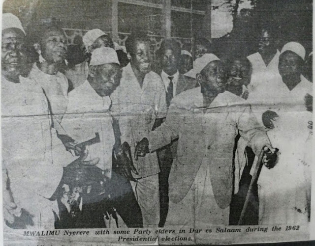 Waliosimama nyuma ni Bantu Group kikundi cha walinzi wa viongozi wa TANU na wahamasishaji na nyuma yao wa kwanza mwenye shati jeupe ni Ali Msham mzalendo wa kwanza kufungua tawi la TANU Magomeni Mapipa 1955