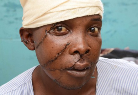 Simon Kiguta akiwa kwenye Hospitali ya Nyeri Feb. 11, 2012. Alikatwakatwa mapanga usoni na mkewe baada ya kurejea nyumbani usiku akiwa amelewa. (Joseph Kanyi/Nation photo)